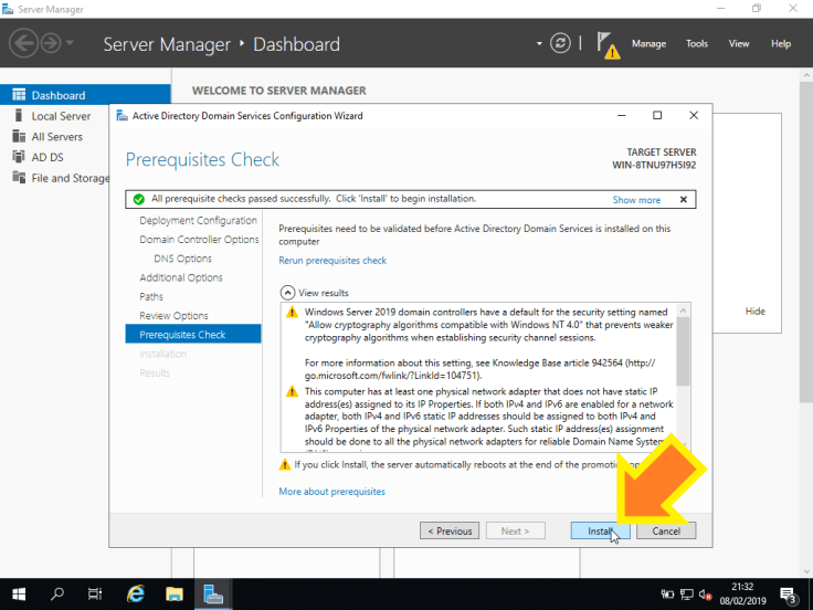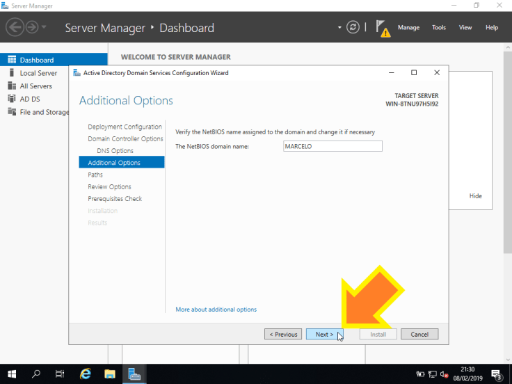 14. Neste passo, podemos definir o NetBIOS name do servidor. Vamos escolher um e clicar em Next >.