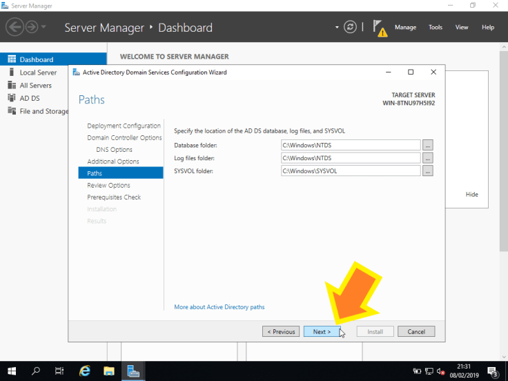 15. Neste passo, podemos especificar a localização da base de dados do AD DS, os ficheiros de log e o SYSVOL. O Windows automaticamente gera as localizações e não é necessário alterá-las em condições normais. Vamos clicar em Next >.