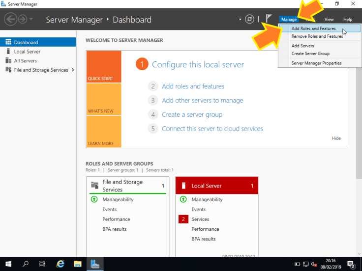 O Windows Server funciona por meio de roles. Cada um deles adiciona uma funcionalidade ao servidor. Assim, como queremos adicionar uma funcionalidade, vamos clicar em Manage e em Add Roles and Features.