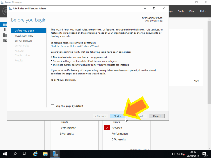 3. Na janela Add Roles and Features Wizard vamos clicar em Next >.