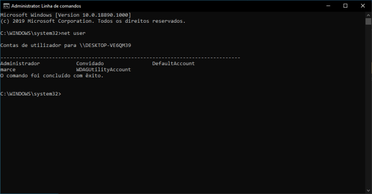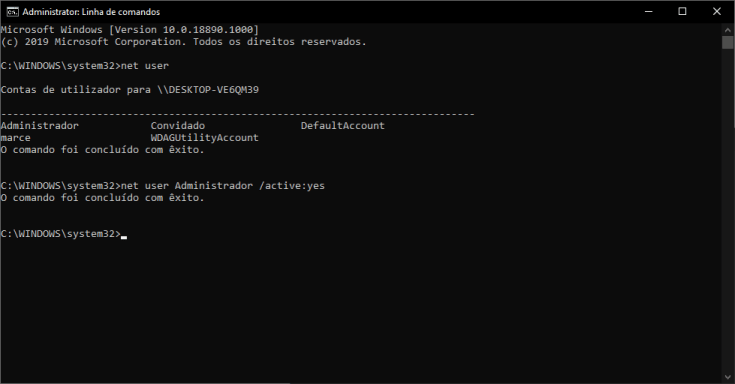 Para a ativarmos vamos executar o seguinte comando: net user Administrador /active:yes