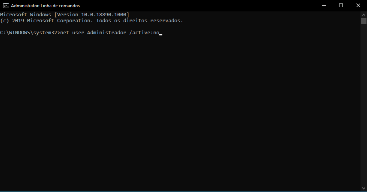Por outro lado, se quisermos desativar a conta, executamos o comando: net user Administrador /active:no