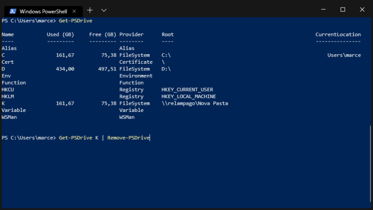New-PSDrive -Name K -PSProvider FileSystem -Root “\\relampago\Nova Pasta” -Persist