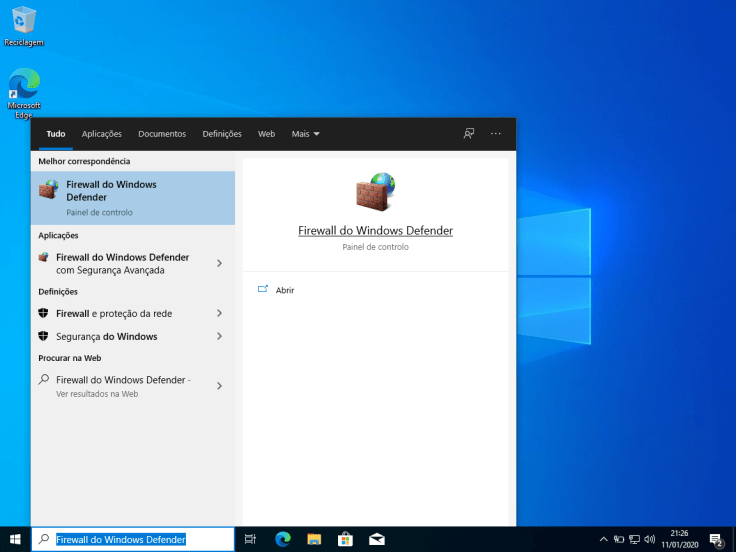 O primeiro passo é, abrir uma exceção na firewall para a partilha de ficheiros e impressoras. Não é nada difícil, visto que o Windows tem já predefinida uma regra que permite isso. Assim, vamos aceder ao menu Iniciar e procurar por Firewall do Windows Defender. Vamos clicar no primeiro resultado.
