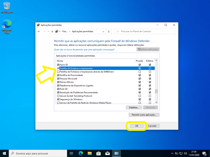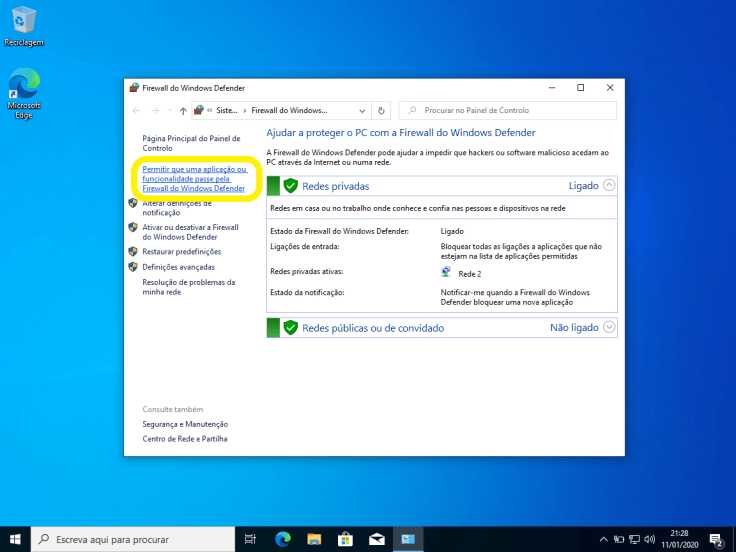 Vamos apenas ativá-la para o perfil privado de rede, ou seja, só funcionara no caso da rede a que o computador for ligado for do tipo doméstica ou de trabalho.