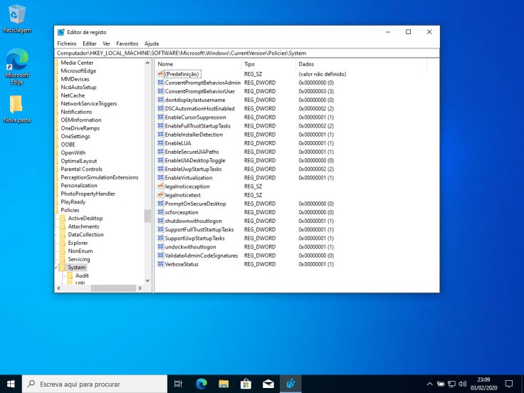Uma vez aberto, vamos navegar até: HKEY_LOCAL_MACHINE\SOFTWARE\Microsoft\Windows\CurrentVersion\Policies\System