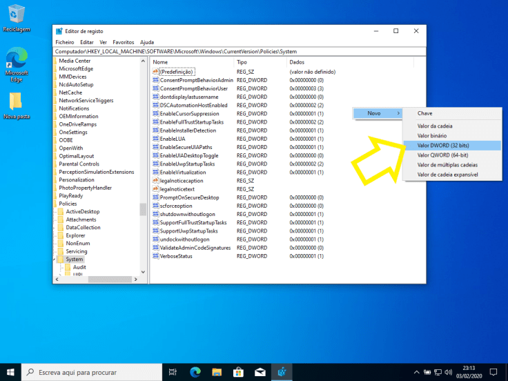 Vamos clicar com o botão direito do rato num espaço livre, selecionar Novo e escolher Valor DWORD (32 bits).