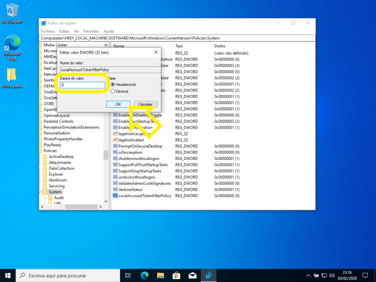 O nome será LocalAccountTokenFilterPolicy. Depois de criado, vamos fazer duplo clique e definir o valor para 1.