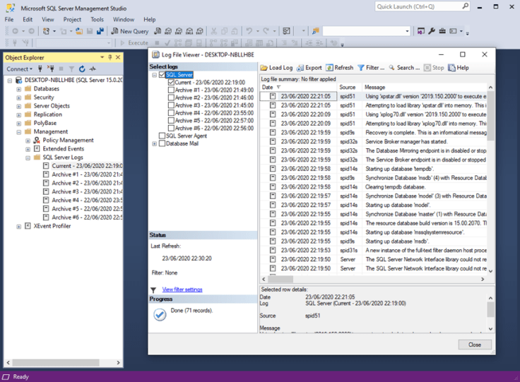Todos estes registos estão acessíveis pelo SSMS ao aceder a Management > SQL Server Logs.