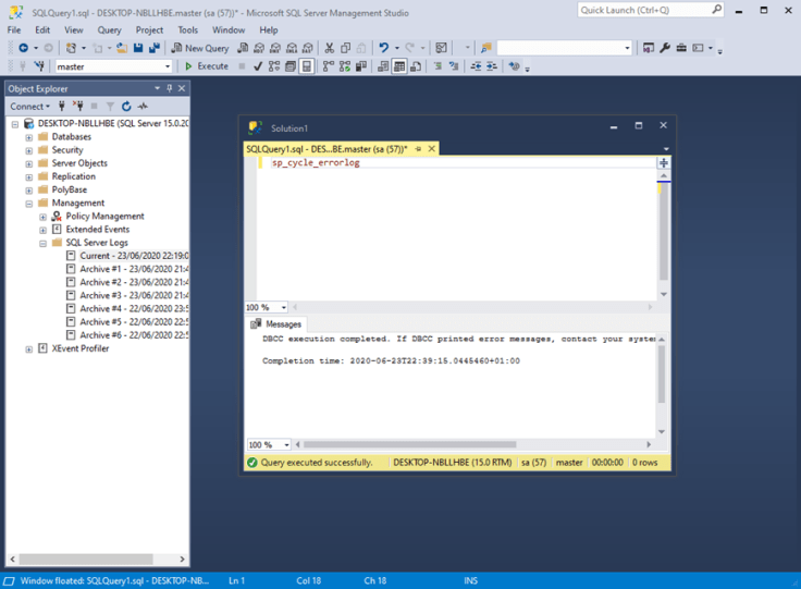 A pensar nessa necessidade, o SQL Server conta com um Stored Procedure que faz o ciclo dos logs sem a necessidade de o reiniciar: