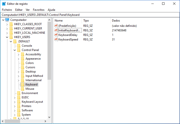 2. Depois, vamos aceder a Computador\HKEY_USERS\.DEFAULT\Control Panel\Keyboard, onde são armazenadas as definições de teclado que o computador aplica enquanto nenhum utilizador inicia sessão.