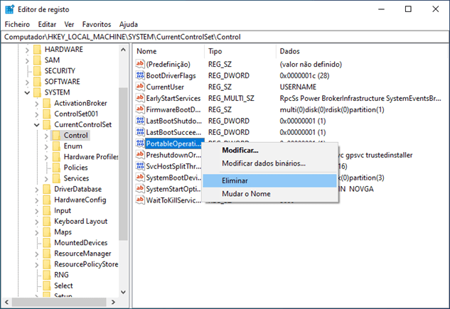 3. Depois, vamos procurar pelo valor DWORD PortableOperatingSystem. O facto de o dado deste valor ser 1 faz com que o Windows pense que está a correr a partir de uma pen USB.