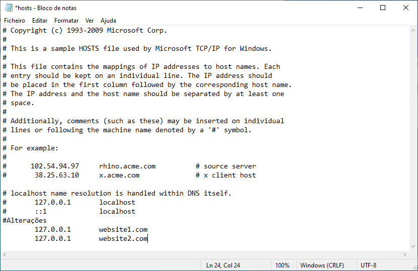 No meu caso, vou apenas alterar o ficheiro hosts do Windows no servidor.