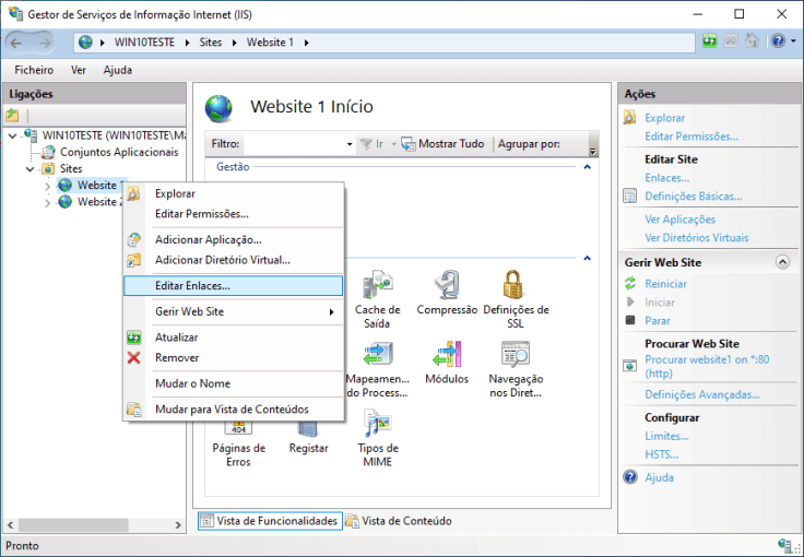 Vamos primeiro tratar do Website 1: vamos fazer clique direito sobre ele e selecionar Editar Enlaces….
