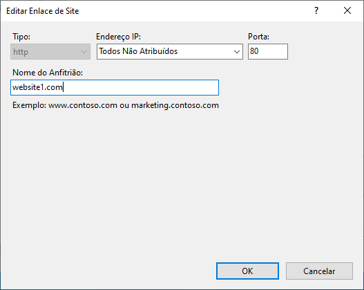Agora, vamos introduzir o host name que queremos para este site. No meu caso, vou colocar website1.com. Depois, basta clicar em OK.