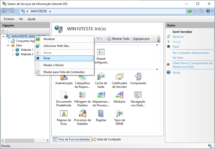 4. Neste momento, vamos reiniciar o IIS de modo a que as alterações entrem em vigor. Basta fazer clique direito sobre o mesmo na lista e selecionar Parar. Depois, fazemos os mesmos passos mas selecionamos Iniciar.