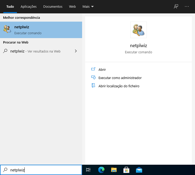 1. O primeiro passo é, no menu Iniciar, procurar por netplwiz e clicar no primeiro resultado.